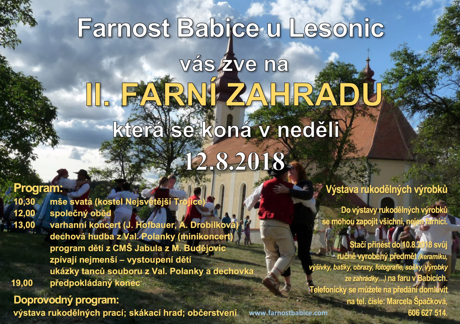 V rámci Farní zahrady bude také výstava rukodělných výrobků. Každý (nejen farníci) může přinést na výstavu své výrobky, do pátku 10.8.2018 na faru v Babicích, nejlépe ve čtvrtek po mši svaté, nebo se domluvit na tel. čísle: Marcela Špačková: 606 627 514. Výrobky mohou být z nejrůznějších oblastí: keramika, výšivky, batiky, obrazy, fotografie, sošky, pěstitelské výrobky apod.