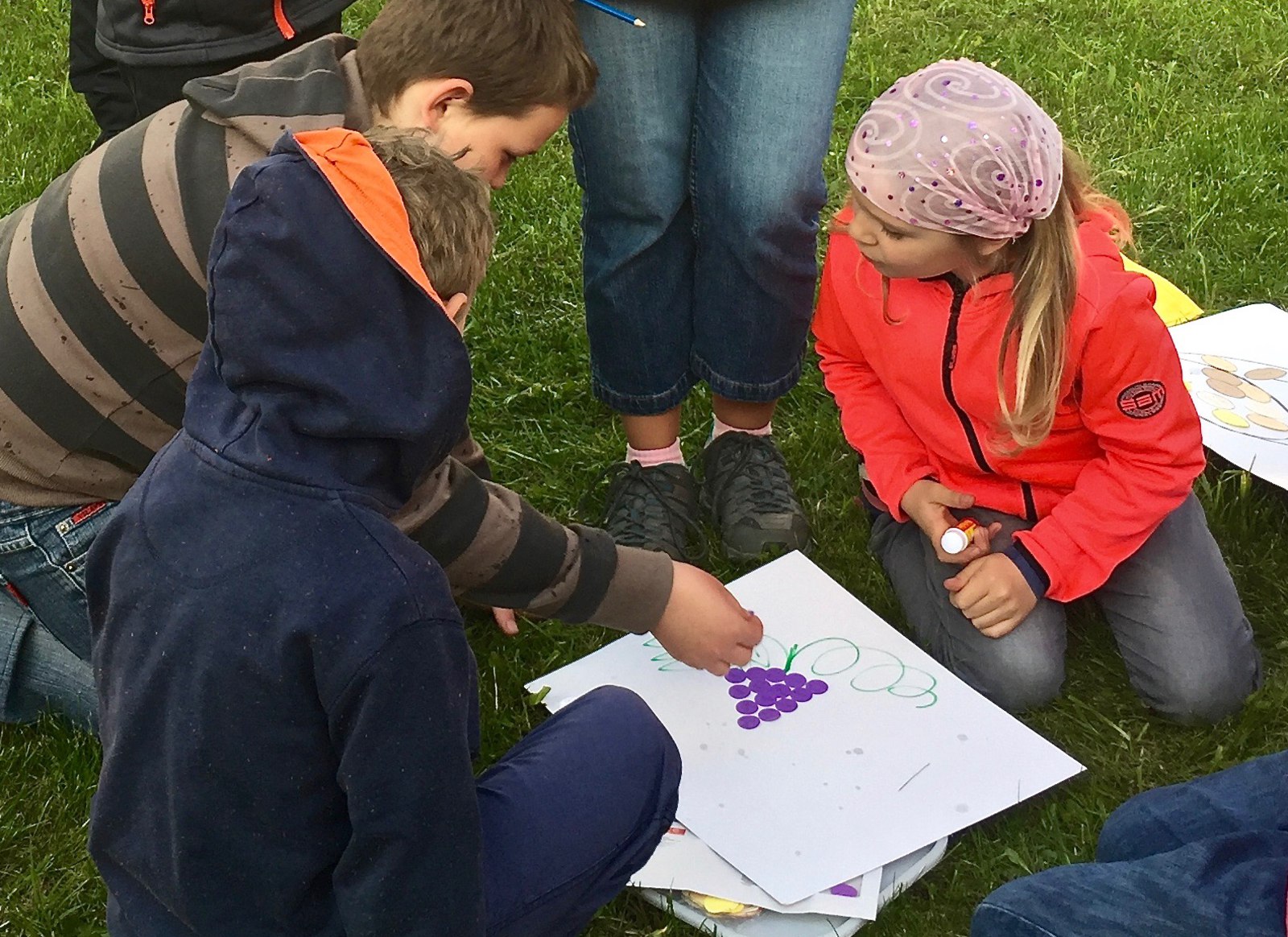 Třetí zastavení opět studánka s vodou; zde naznačovala svátost eucharistie kresba chleba a vinné révy. Děti psaly na papírová zrníčka, co mají rády a na hroznové bobule co je trápí a potom vše nalepily do symbolů chleba a vína.
