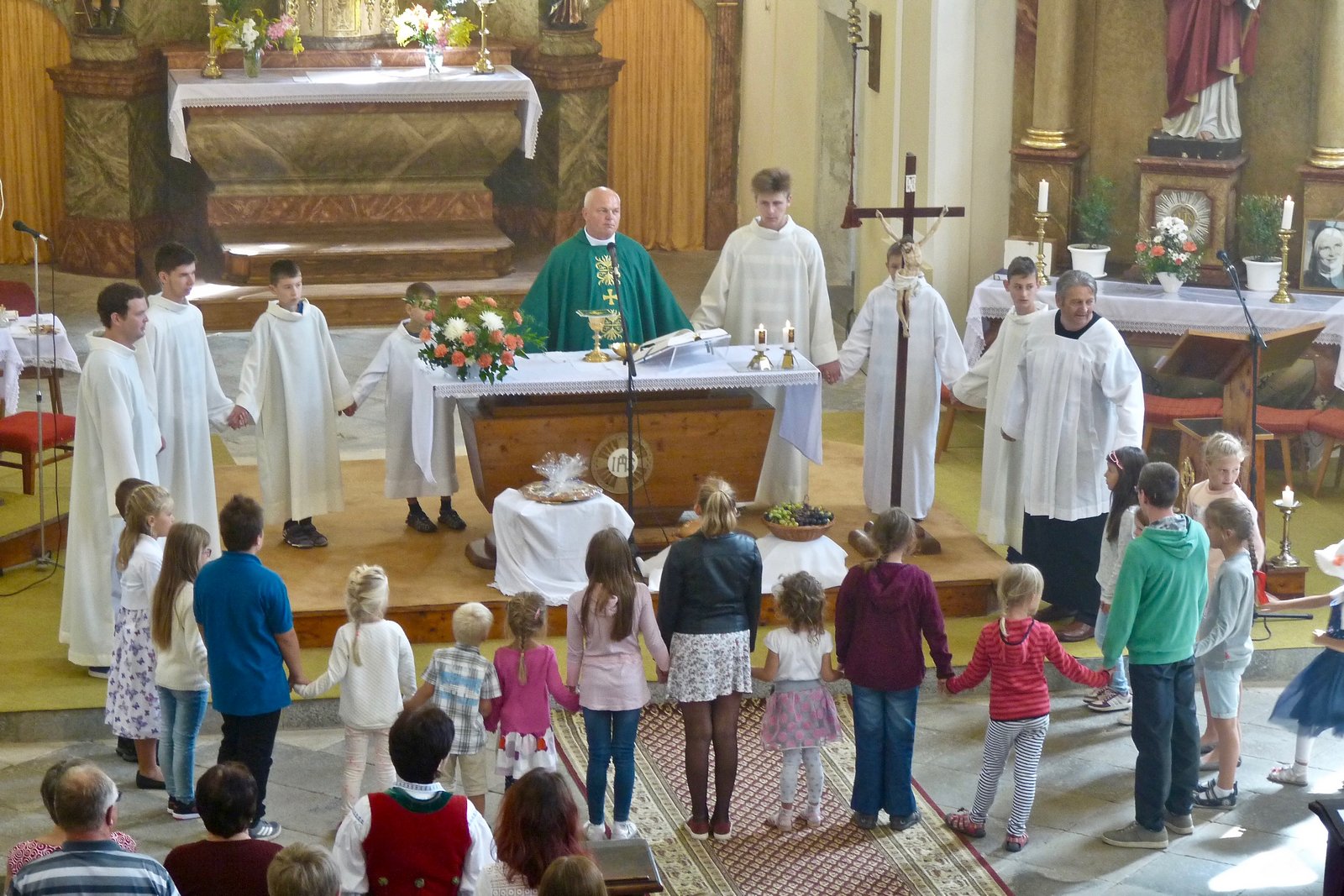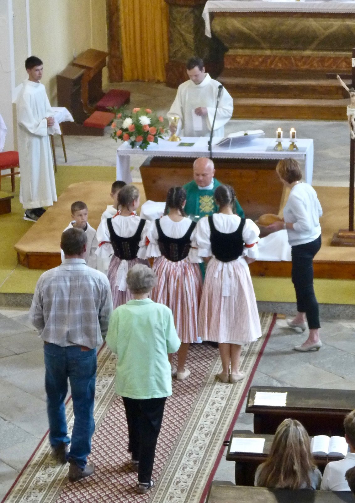 „Farní zahradou“ jsme nazvali setkání několika folklórních seskupení z Moravských Budějovic, Martínkova, Telnice u Brna a Valašské Polanky. Toto setkání začalo slavnou mší svatou, při které zazněly tóny Velehradské fanfáry, zpěvy místní (zmenšené) schóly, ale i mariánská modlitba v podání hostů z Valašské Polanky.