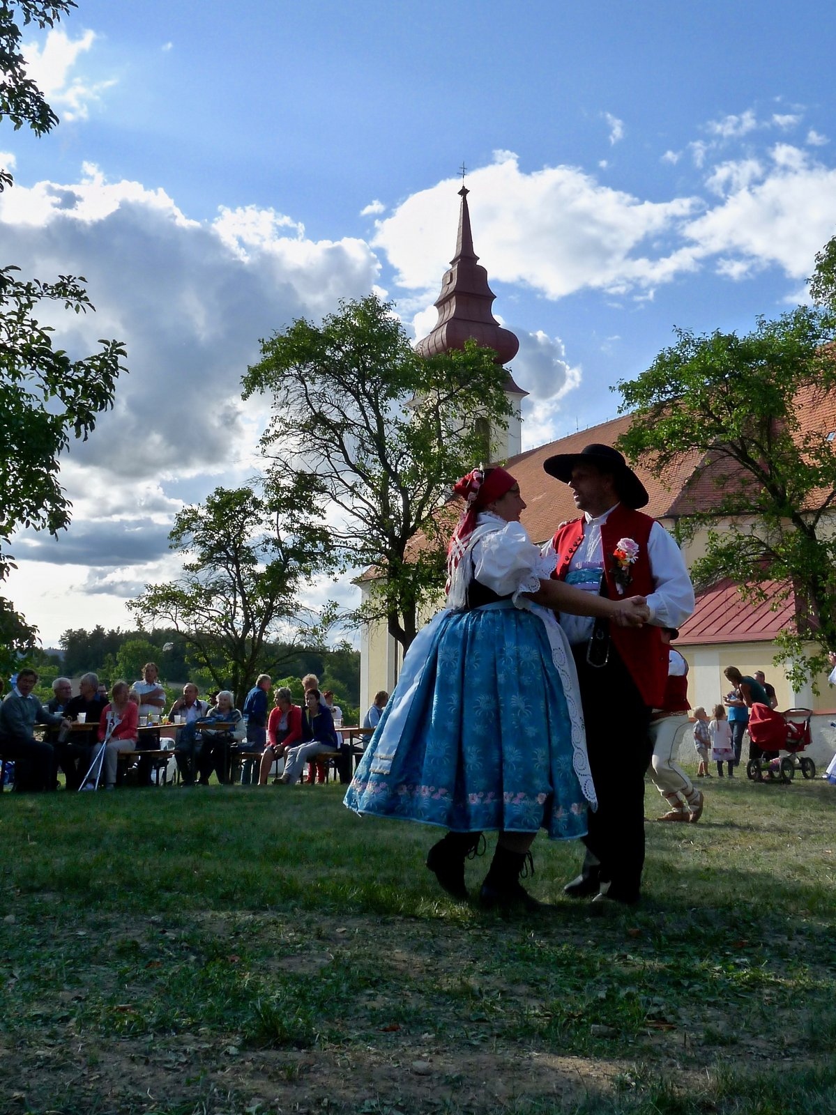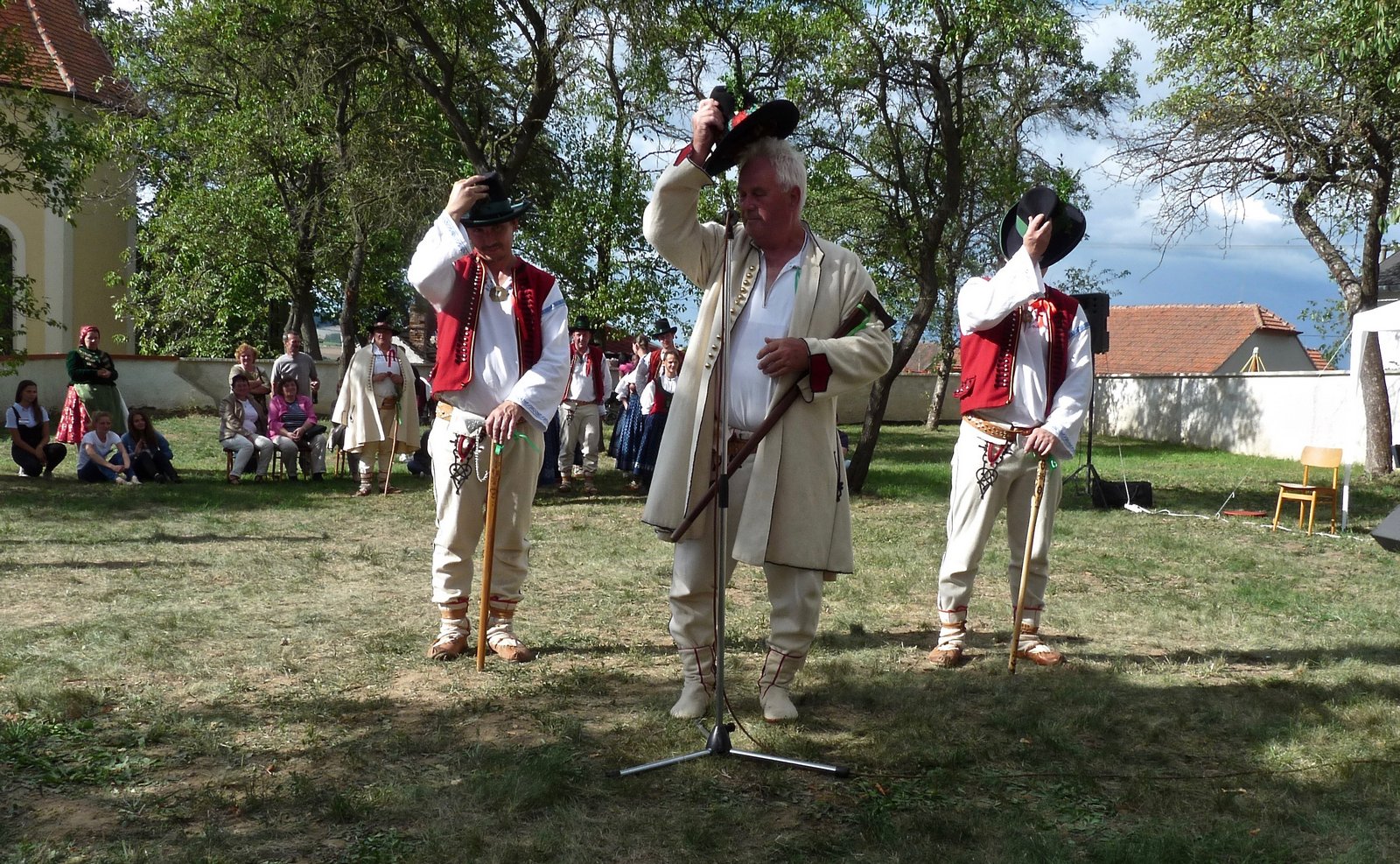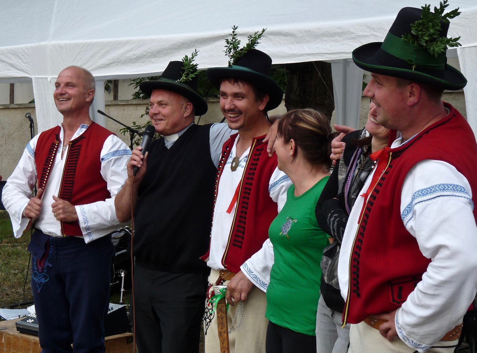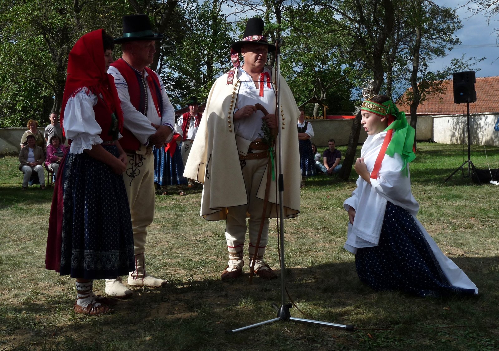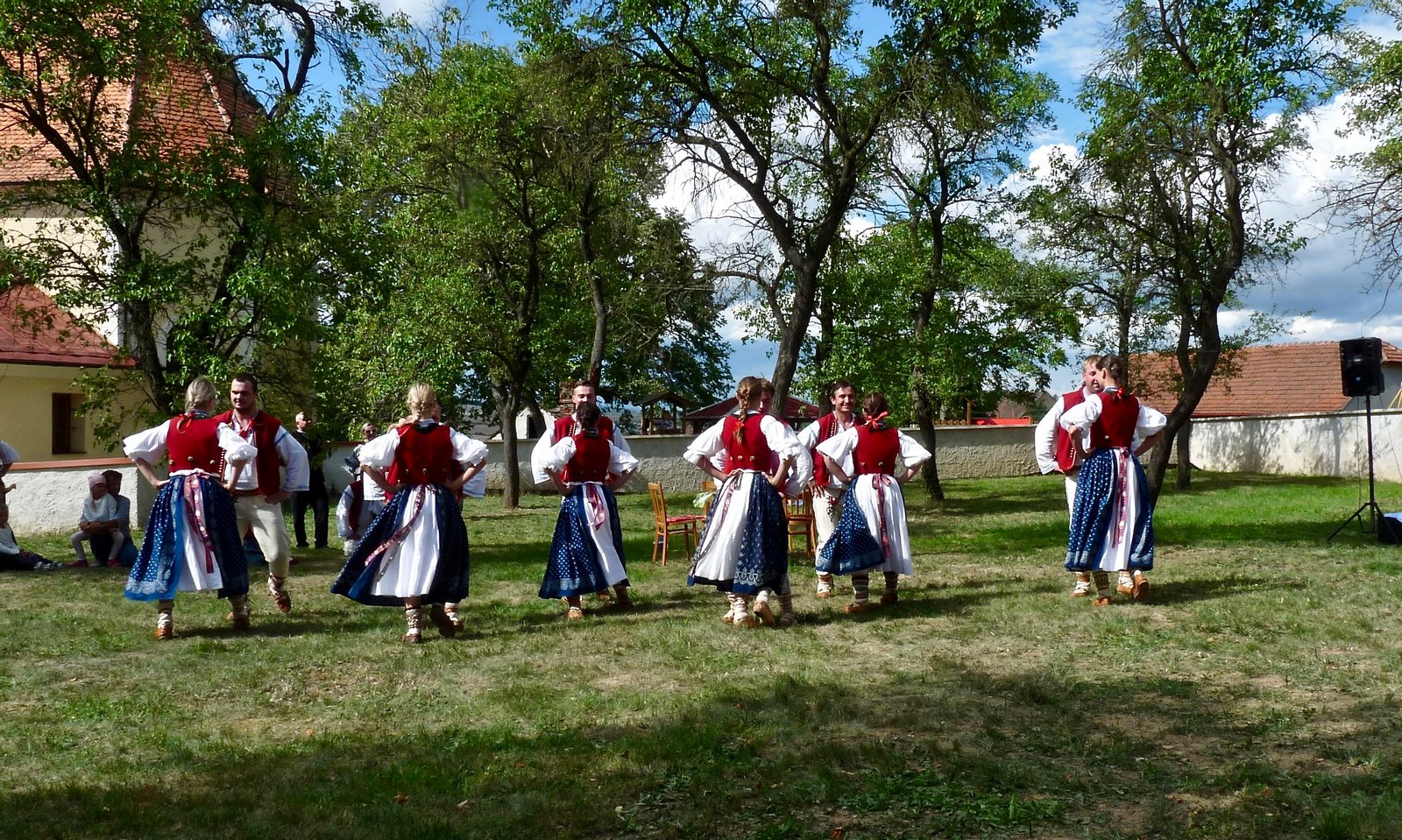 Po výborném guláši (dík paní Kvapilové :-) ), který se podával hned po mši svaté na zahradě u fary, začalo představení folklórních souborů. Dětský soubor z Moravských Budějovic předvedl kouzelné vystoupení pod vedením Aničky Prokopové, soubory z Martinkova a Telnice přijely s nádhernými ukázkami dobových zvyků a tanců ze svého prostředí a na závěr vystoupili Valaši s ukázkou valašských tanců a dovedností ogarů s obušky a zakončili částí „Valašské svatby“, jak ji zaznamenal v kronice místní farář P. Antonín Přibyl (celá „svatba“ by trvala přes 4 hodiny – poznamenal jeden z účinkujících). Menší nevýhodou byl siný vítr, který znemožnil kvalitní poslech, ale když družba oslovil posluchače, aby jim vysvětlil, že chtějí vybrat „opravdu dobrú, pracovitú a hodnú nevěstu pro dvojctihodného ženicha“, a dodal: „vy temu přecaj rozumíte, šak máte také děti!“ mnozí diváci s dojetím přitakali, - to si přeje přece každý, aby jeho děti byly v životě šťastné…
