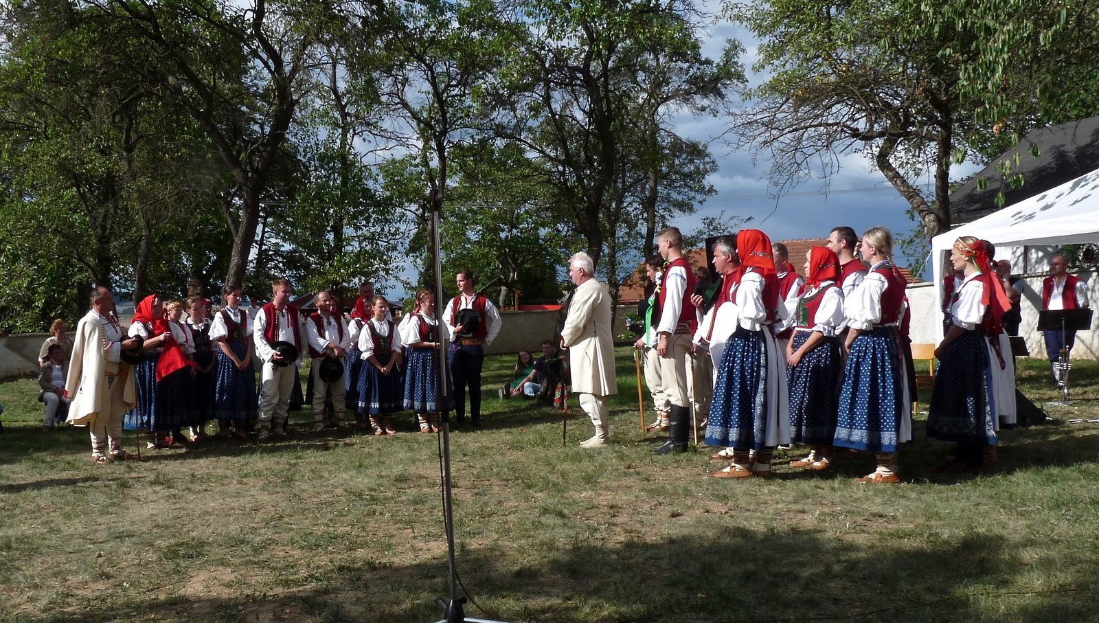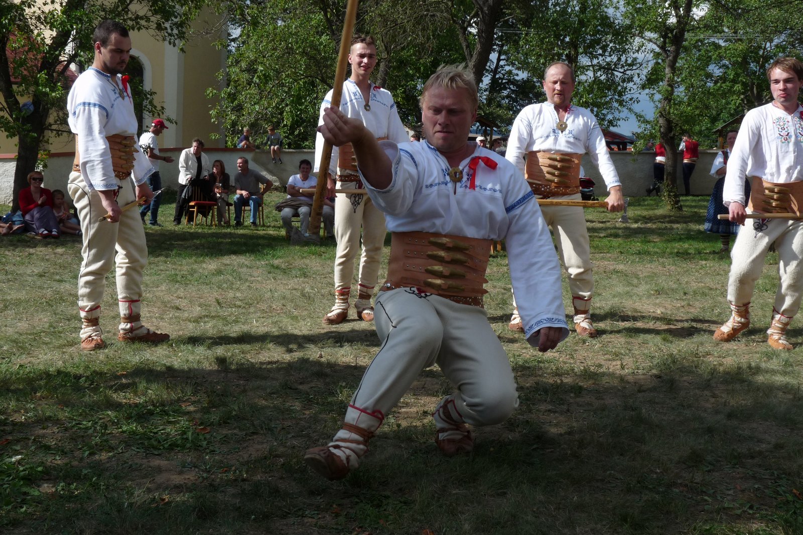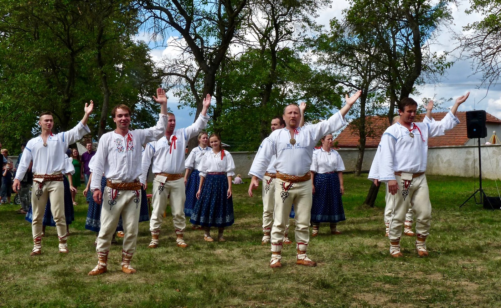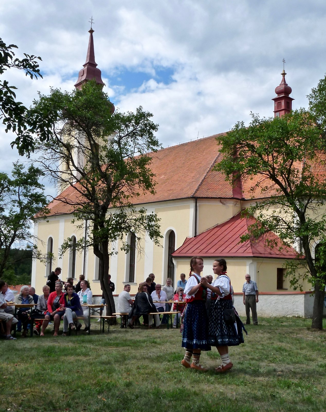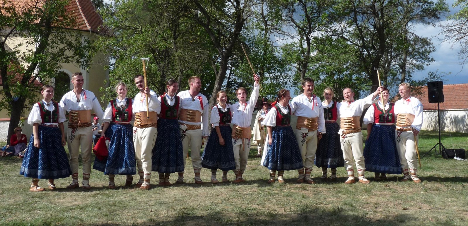 Po výborném guláši (dík paní Kvapilové :-) ), který se podával hned po mši svaté na zahradě u fary, začalo představení folklórních souborů. Dětský soubor z Moravských Budějovic předvedl kouzelné vystoupení pod vedením Aničky Prokopové, soubory z Martinkova a Telnice přijely s nádhernými ukázkami dobových zvyků a tanců ze svého prostředí a na závěr vystoupili Valaši s ukázkou valašských tanců a dovedností ogarů s obušky a zakončili částí „Valašské svatby“, jak ji zaznamenal v kronice místní farář P. Antonín Přibyl (celá „svatba“ by trvala přes 4 hodiny – poznamenal jeden z účinkujících). Menší nevýhodou byl siný vítr, který znemožnil kvalitní poslech, ale když družba oslovil posluchače, aby jim vysvětlil, že chtějí vybrat „opravdu dobrú, pracovitú a hodnú nevěstu pro dvojctihodného ženicha“, a dodal: „vy temu přecaj rozumíte, šak máte také děti!“ mnozí diváci s dojetím přitakali, - to si přeje přece každý, aby jeho děti byly v životě šťastné…