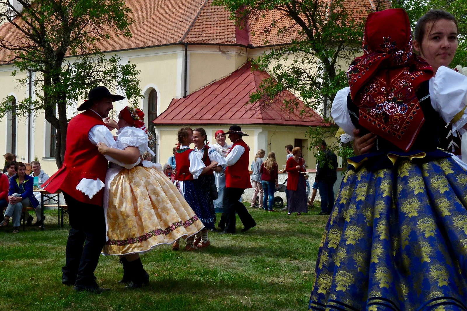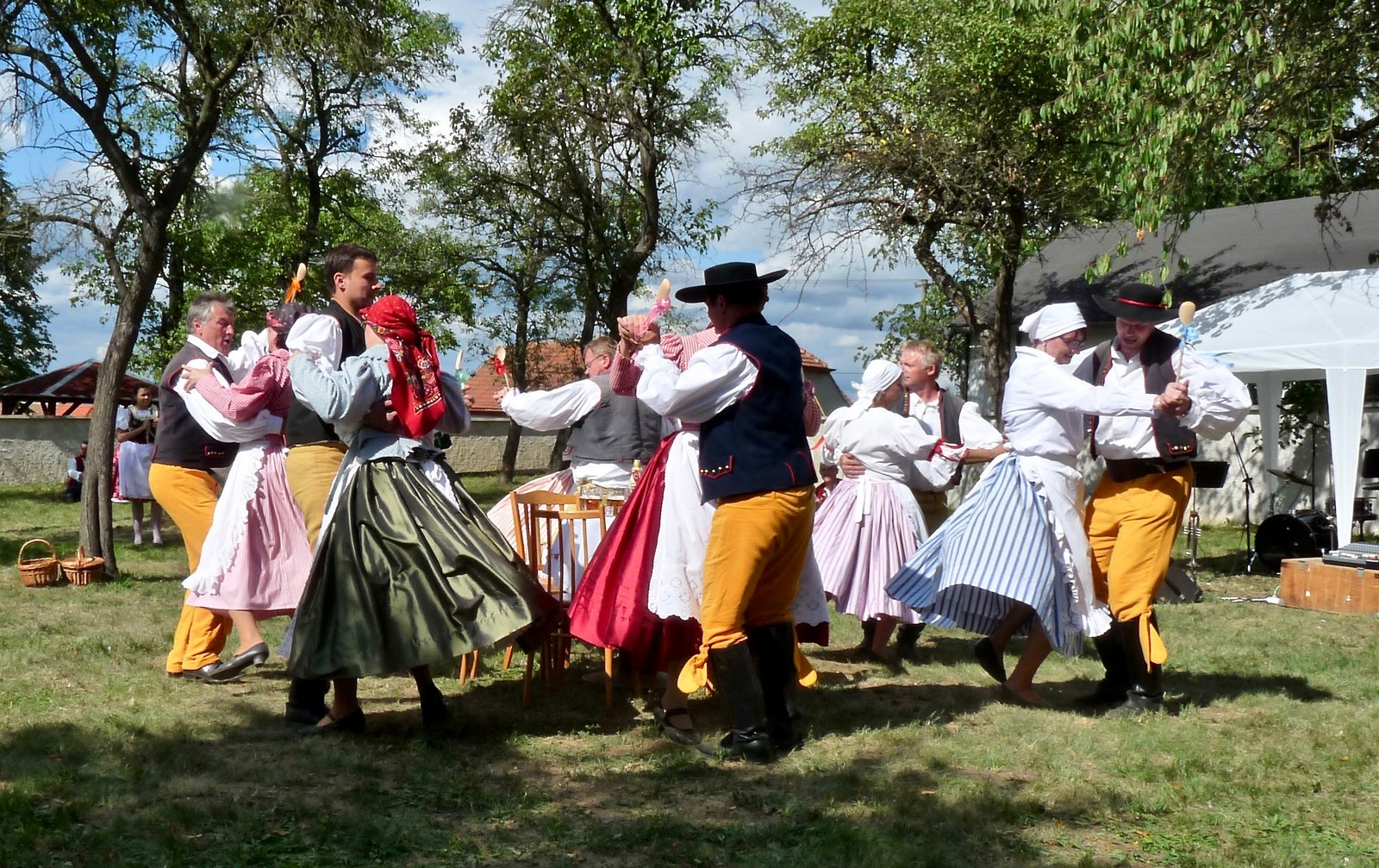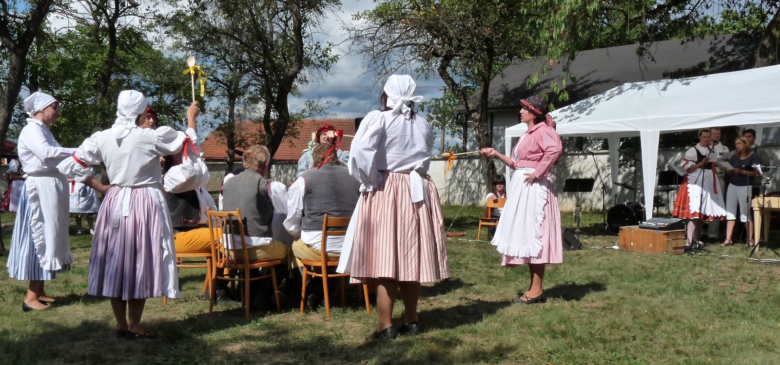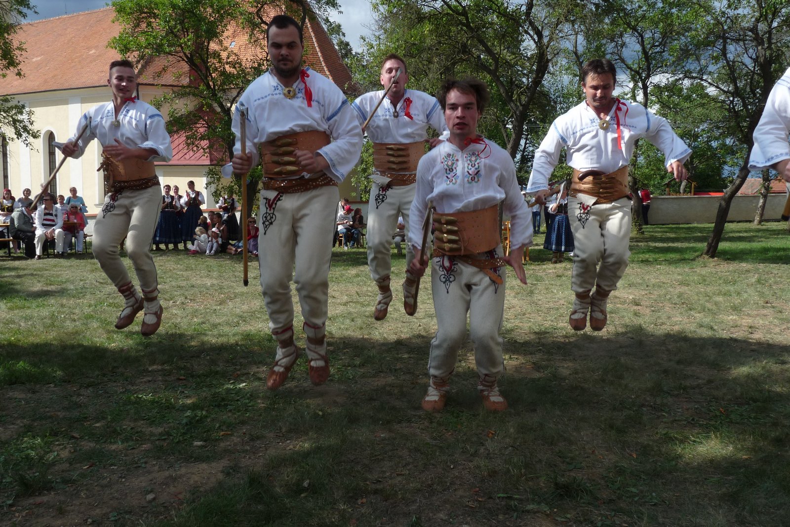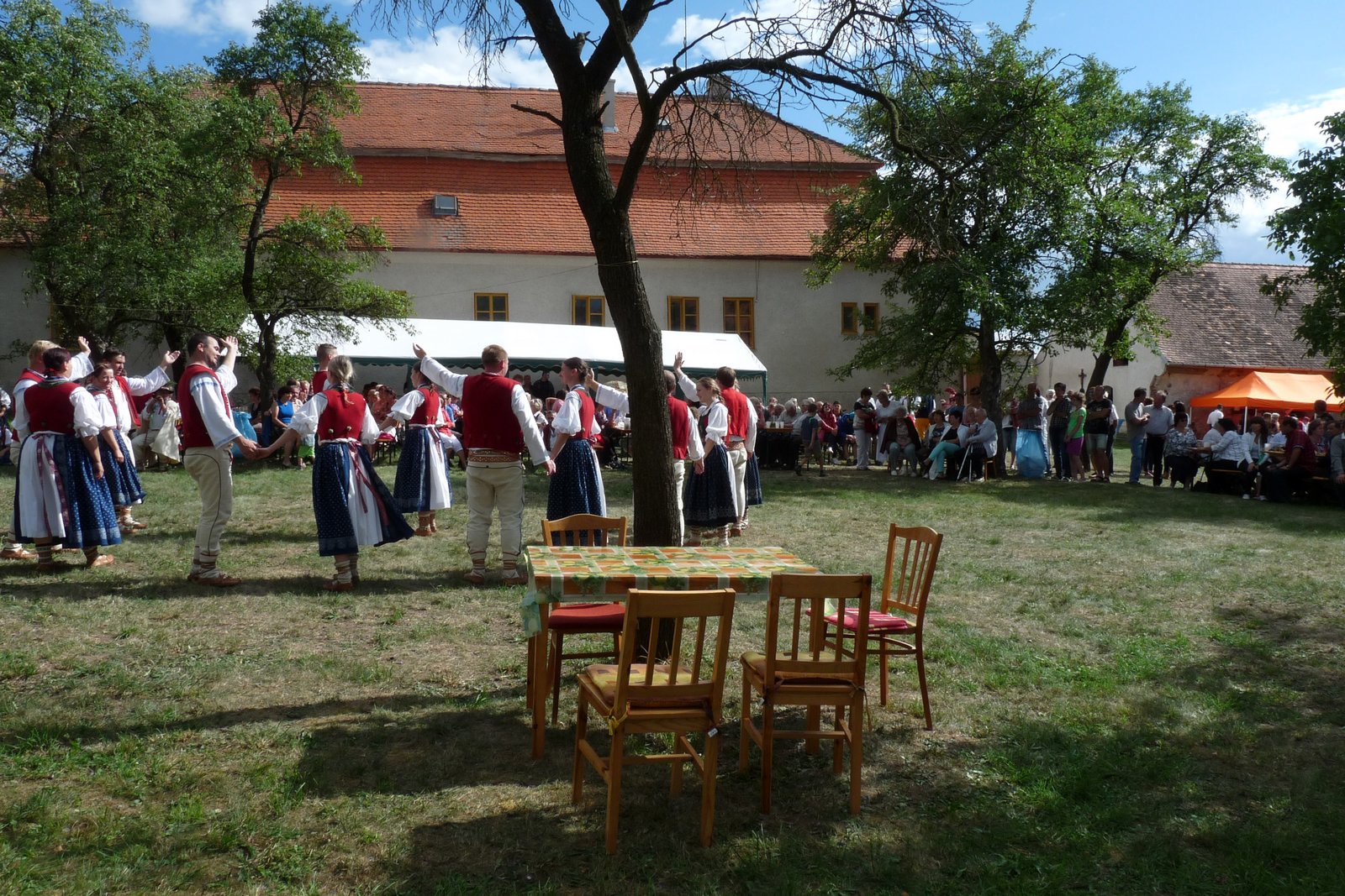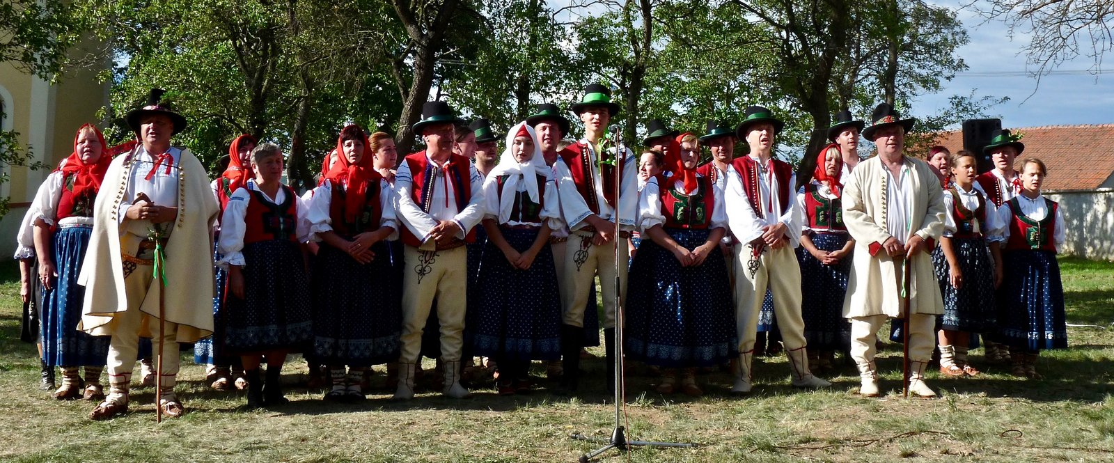 Po výborném guláši (dík paní Kvapilové :-) ), který se podával hned po mši svaté na zahradě u fary, začalo představení folklórních souborů. Dětský soubor z Moravských Budějovic předvedl kouzelné vystoupení pod vedením Aničky Prokopové, soubory z Martinkova a Telnice přijely s nádhernými ukázkami dobových zvyků a tanců ze svého prostředí a na závěr vystoupili Valaši s ukázkou valašských tanců a dovedností ogarů s obušky a zakončili částí „Valašské svatby“, jak ji zaznamenal v kronice místní farář P. Antonín Přibyl (celá „svatba“ by trvala přes 4 hodiny – poznamenal jeden z účinkujících). Menší nevýhodou byl siný vítr, který znemožnil kvalitní poslech, ale když družba oslovil posluchače, aby jim vysvětlil, že chtějí vybrat „opravdu dobrú, pracovitú a hodnú nevěstu pro dvojctihodného ženicha“, a dodal: „vy temu přecaj rozumíte, šak máte také děti!“ mnozí diváci s dojetím přitakali, - to si přeje přece každý, aby jeho děti byly v životě šťastné…