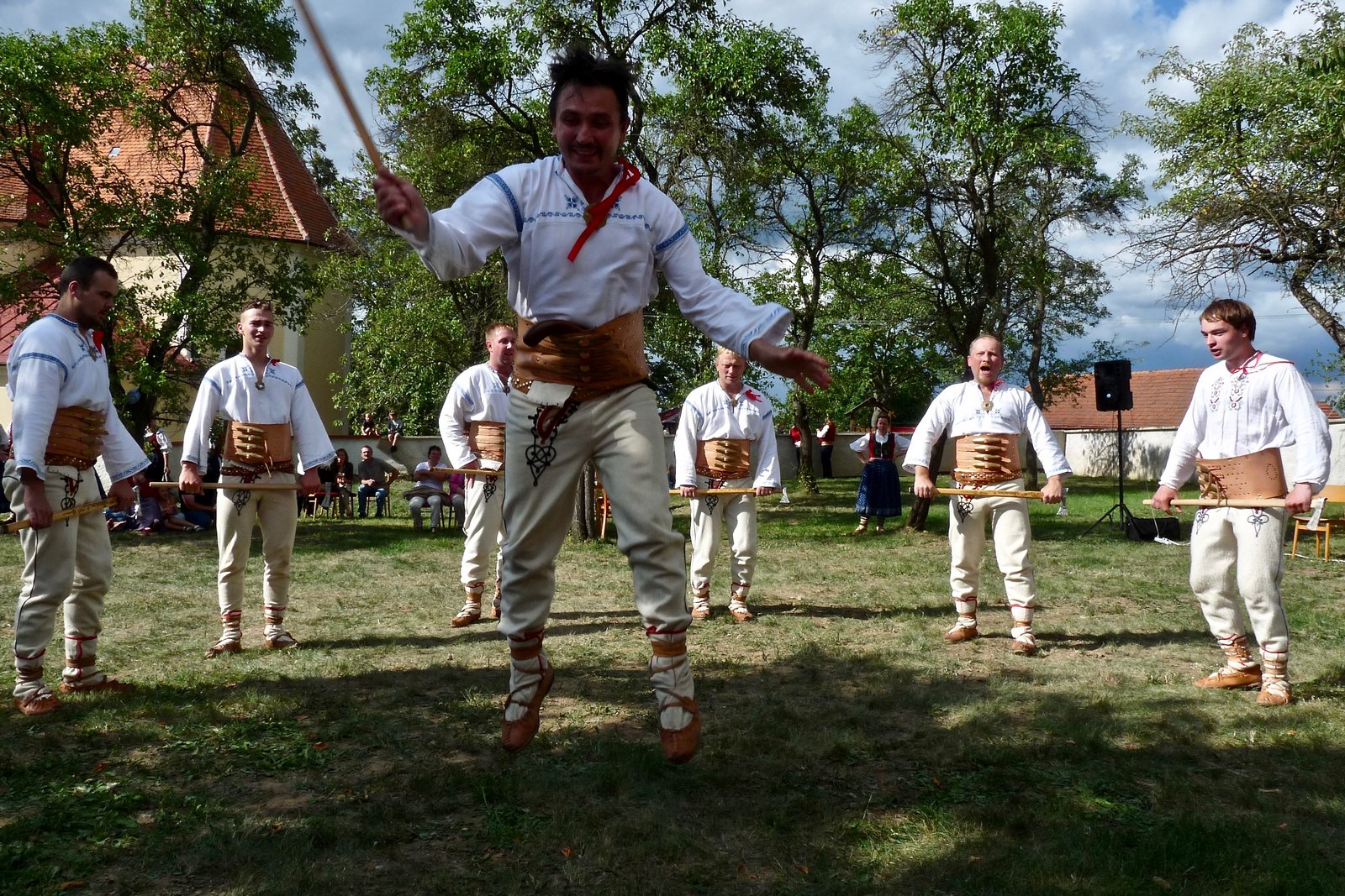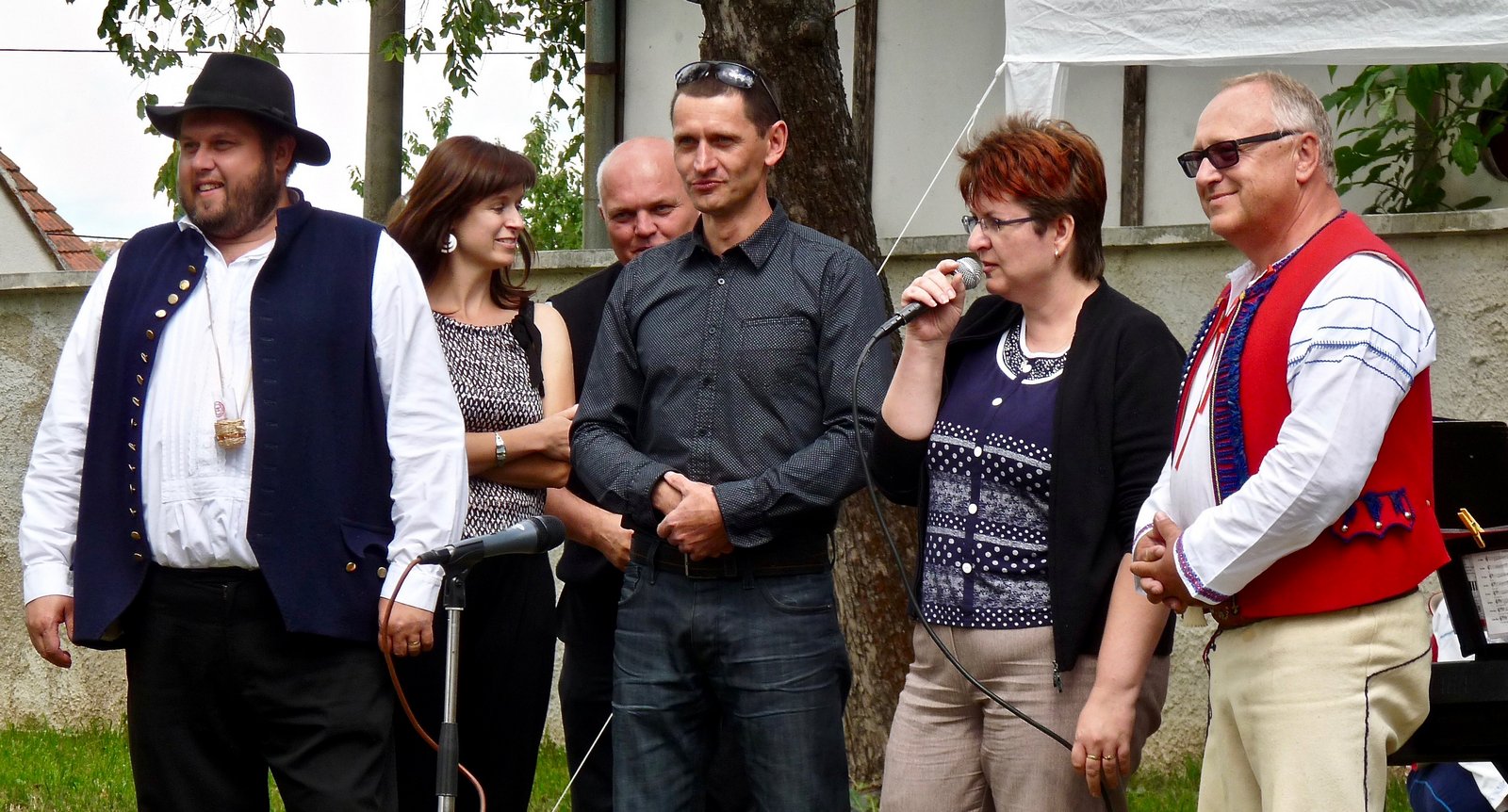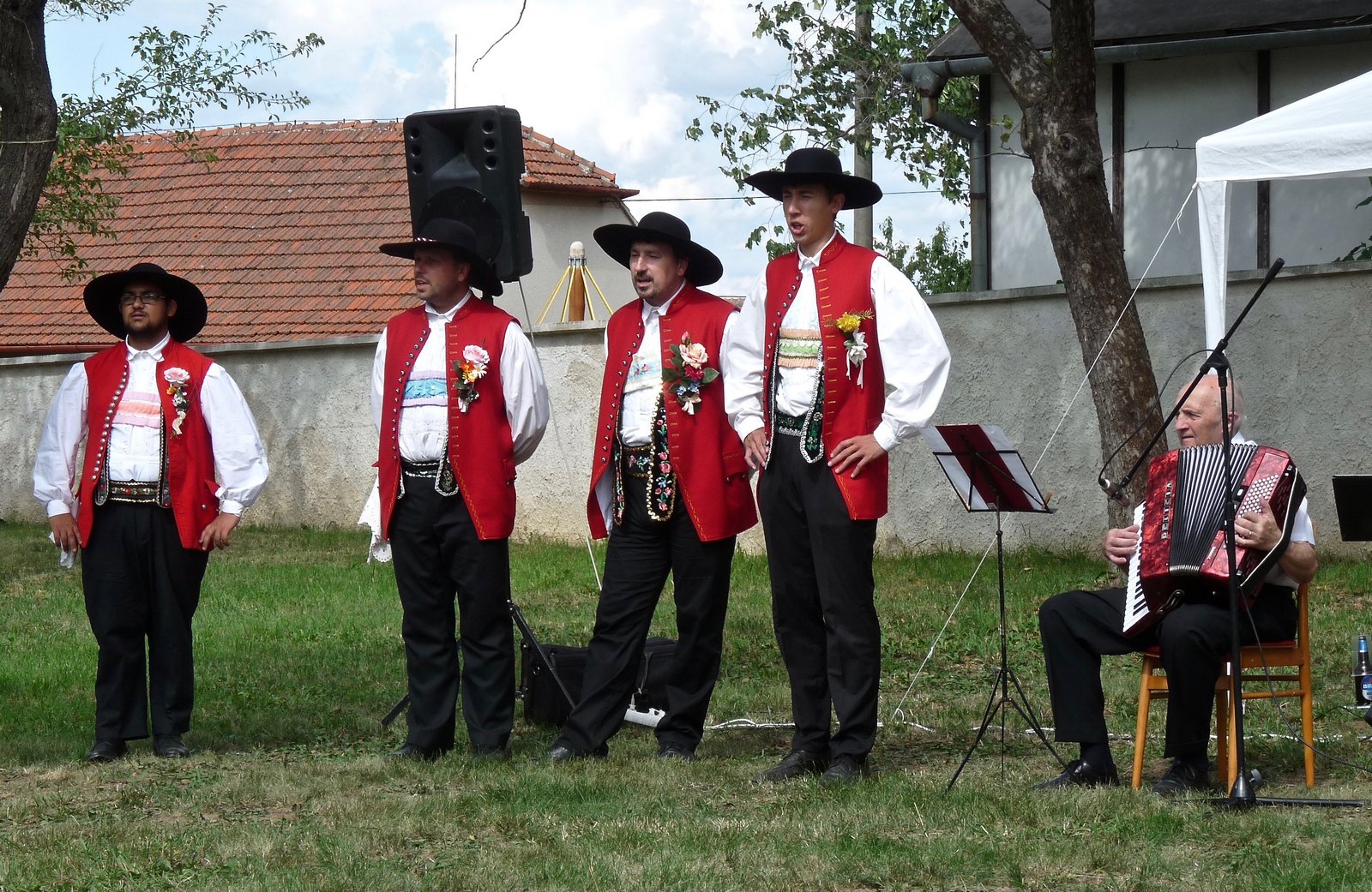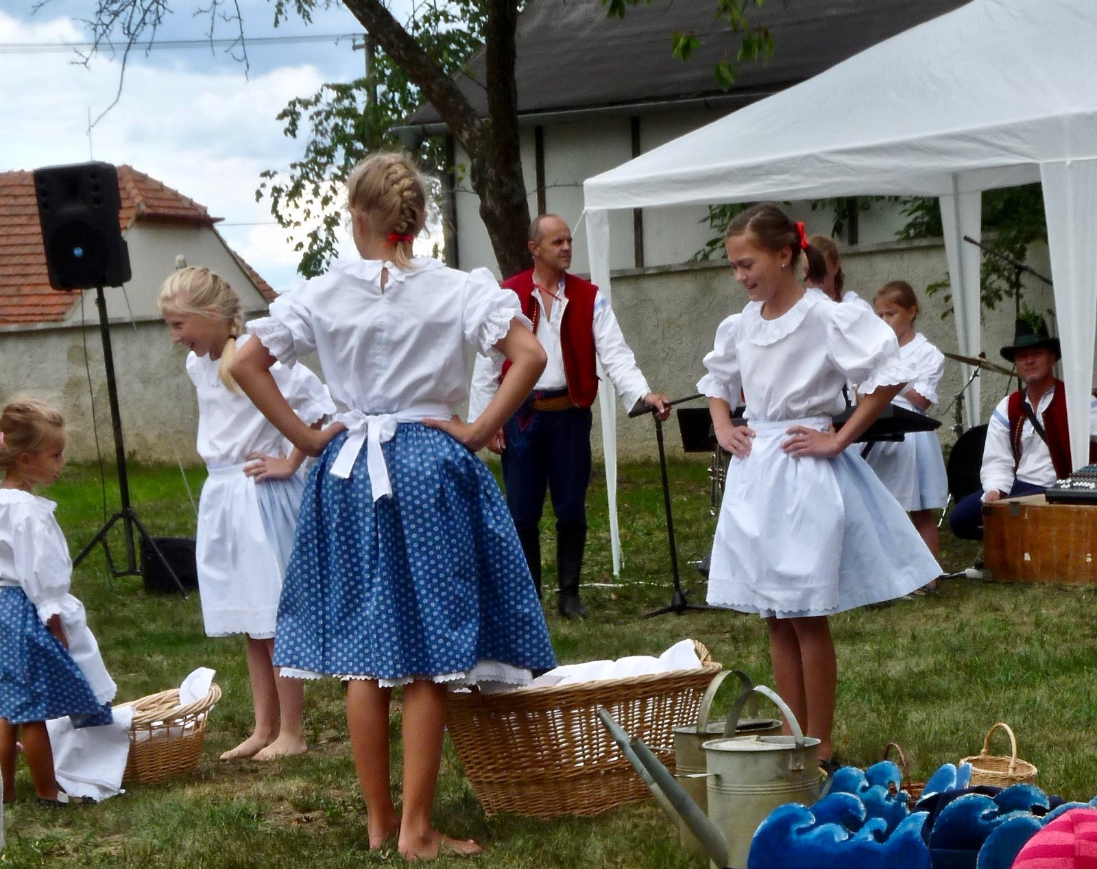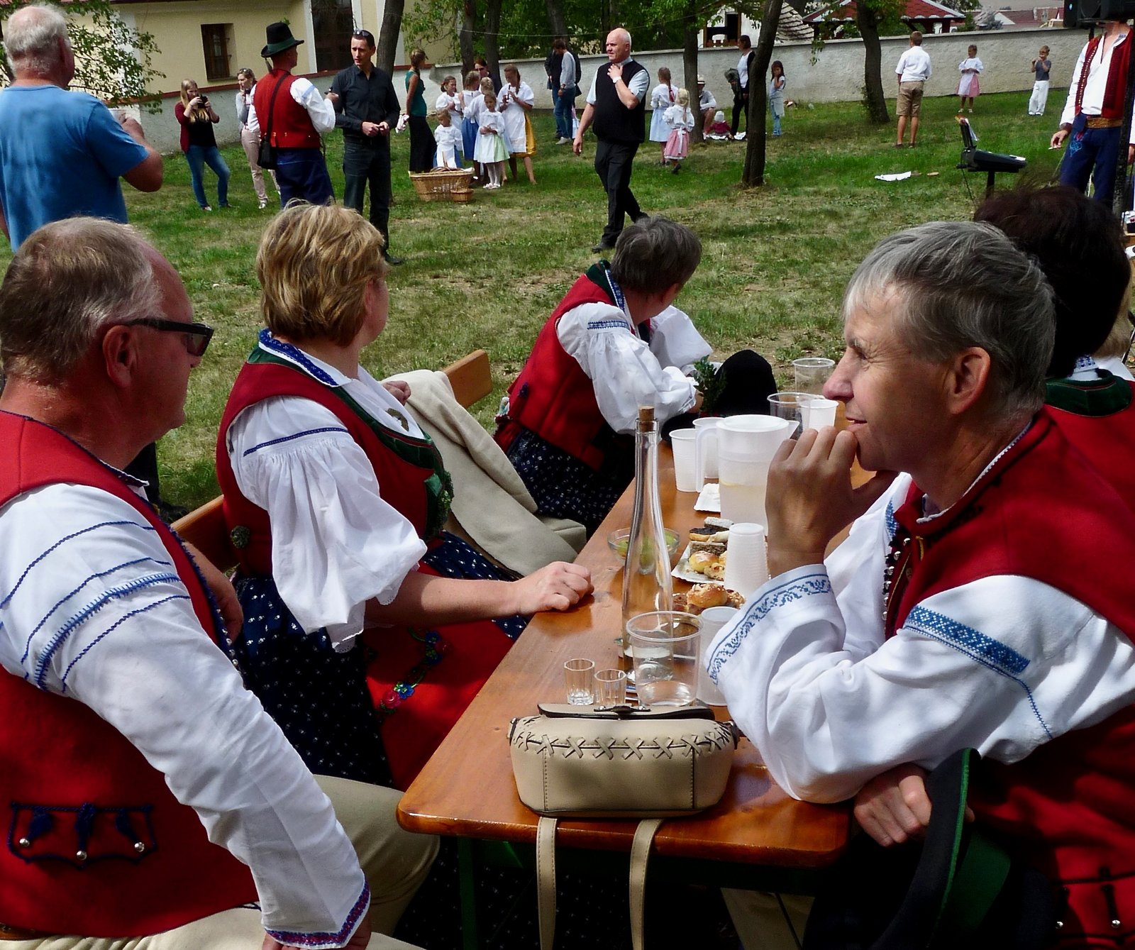 Po výborném guláši (dík paní Kvapilové :-) ), který se podával hned po mši svaté na zahradě u fary, začalo představení folklórních souborů. Dětský soubor z Moravských Budějovic předvedl kouzelné vystoupení pod vedením Aničky Prokopové, soubory z Martinkova a Telnice přijely s nádhernými ukázkami dobových zvyků a tanců ze svého prostředí a na závěr vystoupili Valaši s ukázkou valašských tanců a dovedností ogarů s obušky a zakončili částí „Valašské svatby“, jak ji zaznamenal v kronice místní farář P. Antonín Přibyl (celá „svatba“ by trvala přes 4 hodiny – poznamenal jeden z účinkujících). Menší nevýhodou byl siný vítr, který znemožnil kvalitní poslech, ale když družba oslovil posluchače, aby jim vysvětlil, že chtějí vybrat „opravdu dobrú, pracovitú a hodnú nevěstu pro dvojctihodného ženicha“, a dodal: „vy temu přecaj rozumíte, šak máte také děti!“ mnozí diváci s dojetím přitakali, - to si přeje přece každý, aby jeho děti byly v životě šťastné…