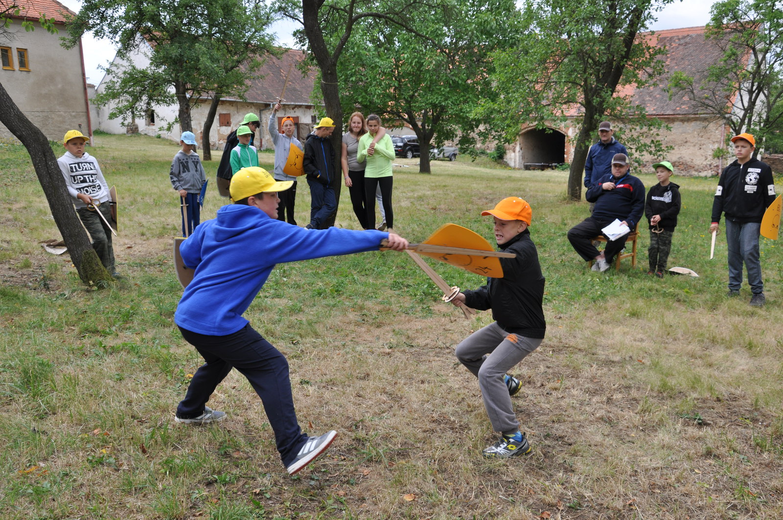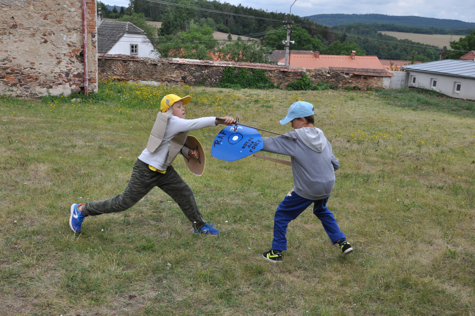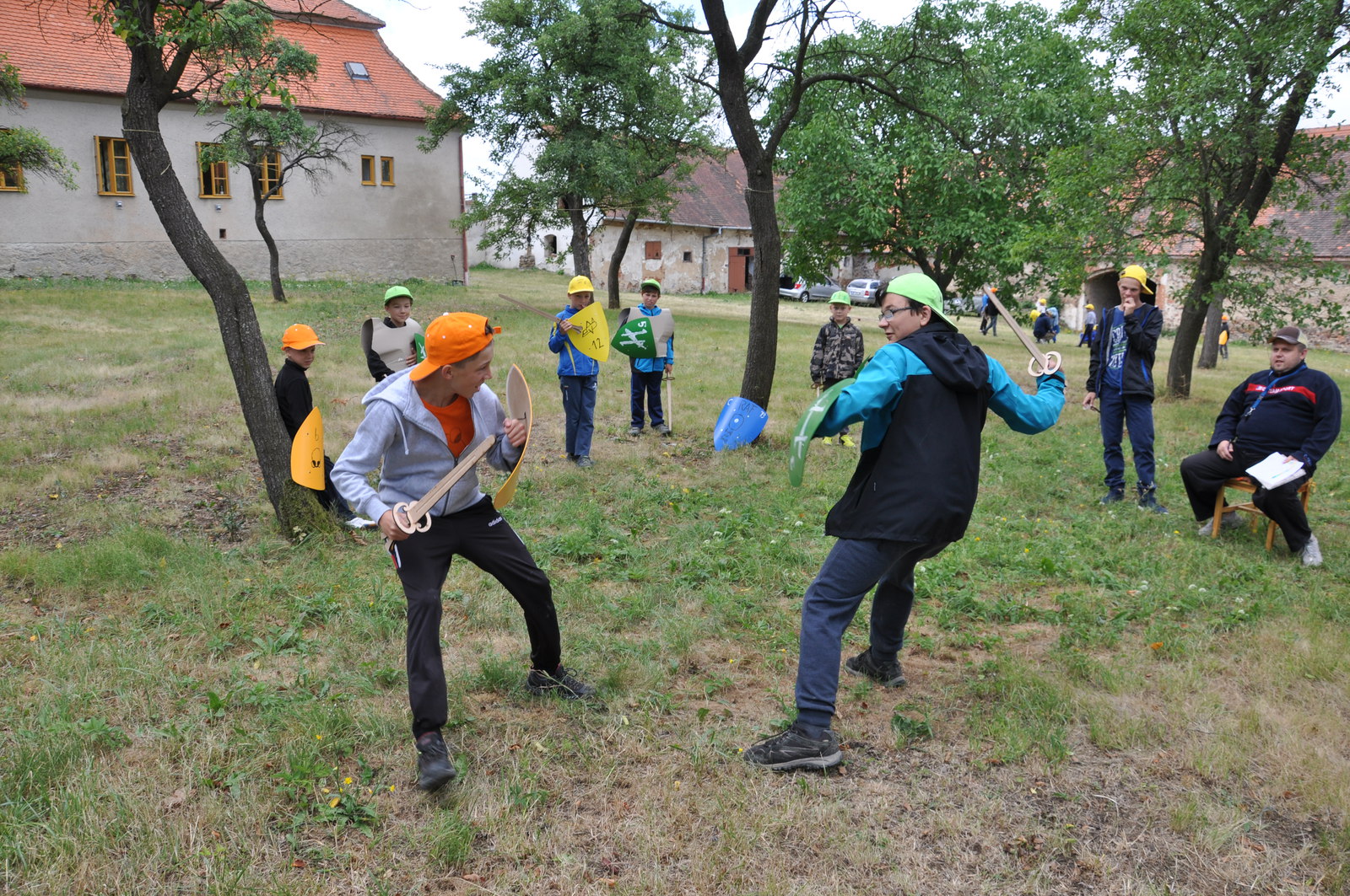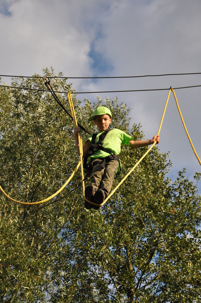 Při venkovním programu jsme museli bojovat s nepřízní počasí, takže některé sportovní aktivity doslova uhýbaly dešti, některé se hold odehrály v něm (náš táborový fotbalový turnaj v Cidlině) – nakonec, hrdinové přece nebývají z cukru... Sportovních klání bylo tradičně dostatek: kromě fotbálku na trávě i ve vodě nás čekalo ragby s upravenými pravidly, baseball, rytířské hry (šerm mečem, silové disciplíny), střelba z luku a vzduchovky, výstup na lezecké stěně, procházka s chůdami, zdolání adrenalinové lanové trati v osmi metrové výšce, ale třeba i jízda zručnosti na čtyřkolce. Díky panu děkanovi Josefovi Brychtovi z Jemnice jsme si mohli porovnat síly ve fotbale s domácími ministranty, remízový zápas musely rozhodnout penalty, ve kterých nás místní kluci předčili. Gratulujeme!