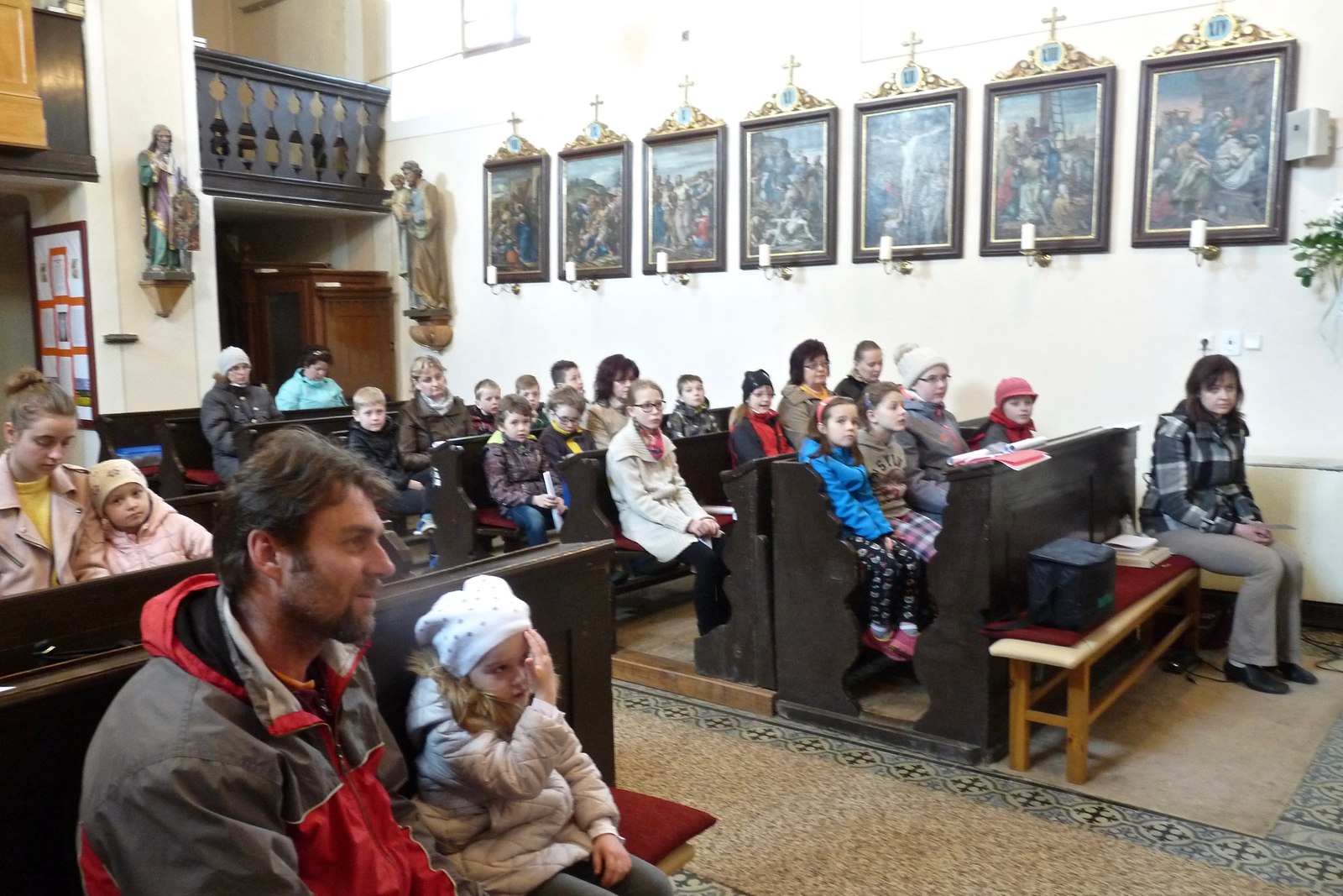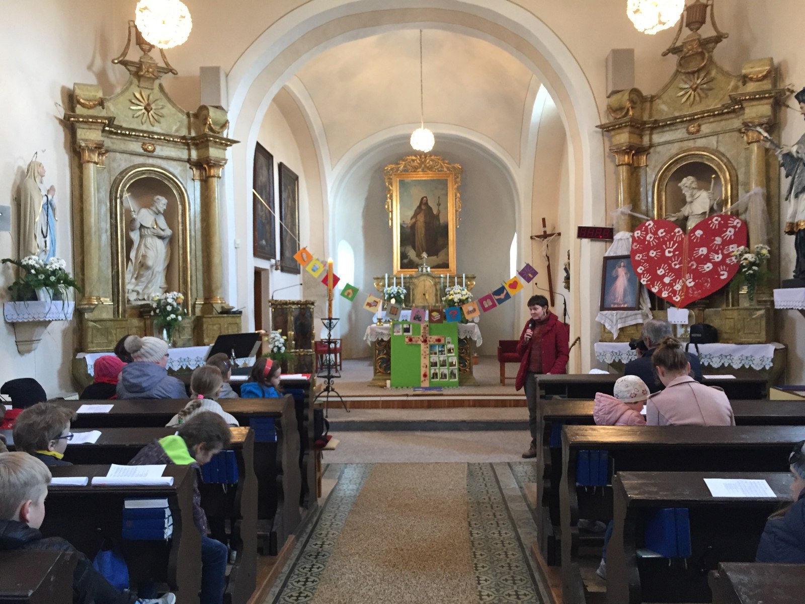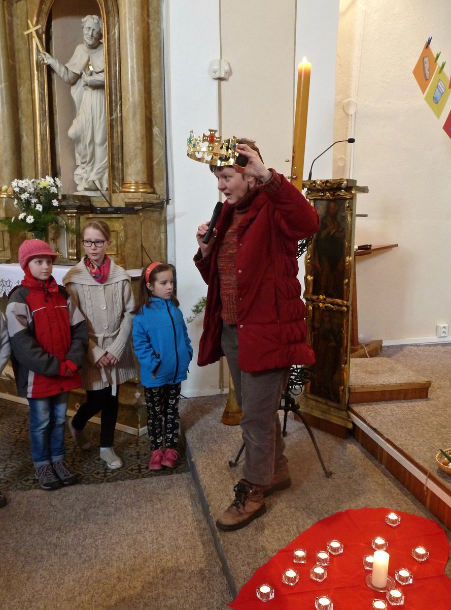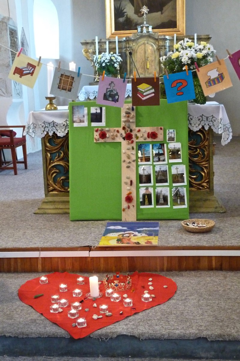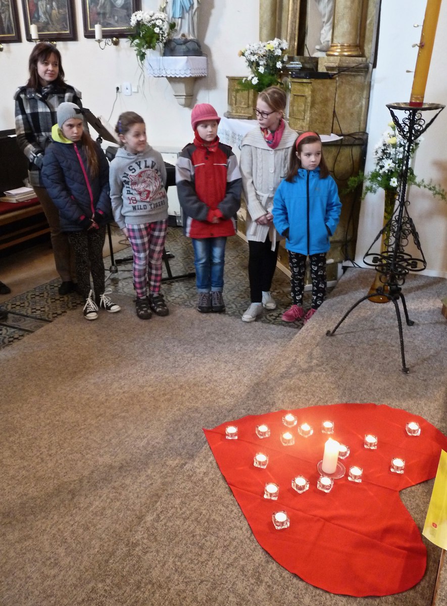 S dětmi, jejich rodiči a prarodiči jsme se sešli ve 14,30 před kostelem, kde byly dětem rozdány obrázky se skutky tělesného a duchovního milosrdenství, které nesly v průvodu do kostela a v presbytáři přečetly modlitbu na těchto obrázcích. P. Ladislav Kozubík přečetl evangelium o Milosrdném otci a vyslechli jsme si duchovní slovo. Tuto pobožnost doprovázely děti zpěvem písní a žalmu. Na rozprostřené srdce před obětním stolem děti kladly svíce na znamení, že chtějí mít své srdce blízko Ježíši, a kamínky na znamení, že chtějí Ježíši svěřit své těžkosti bolesti a starosti. Paní katechetka Jitka Šebková vysvětlila dětem i nám všem vztah Ježíše - milosrdného Krále - ke všem lidem. My, kteří se smíme nazývat Božími dětmi, máme tedy jako Ježíš " moc" konat milosrdenství - dobrým skutkem, dobrým slovem, modlitbou.