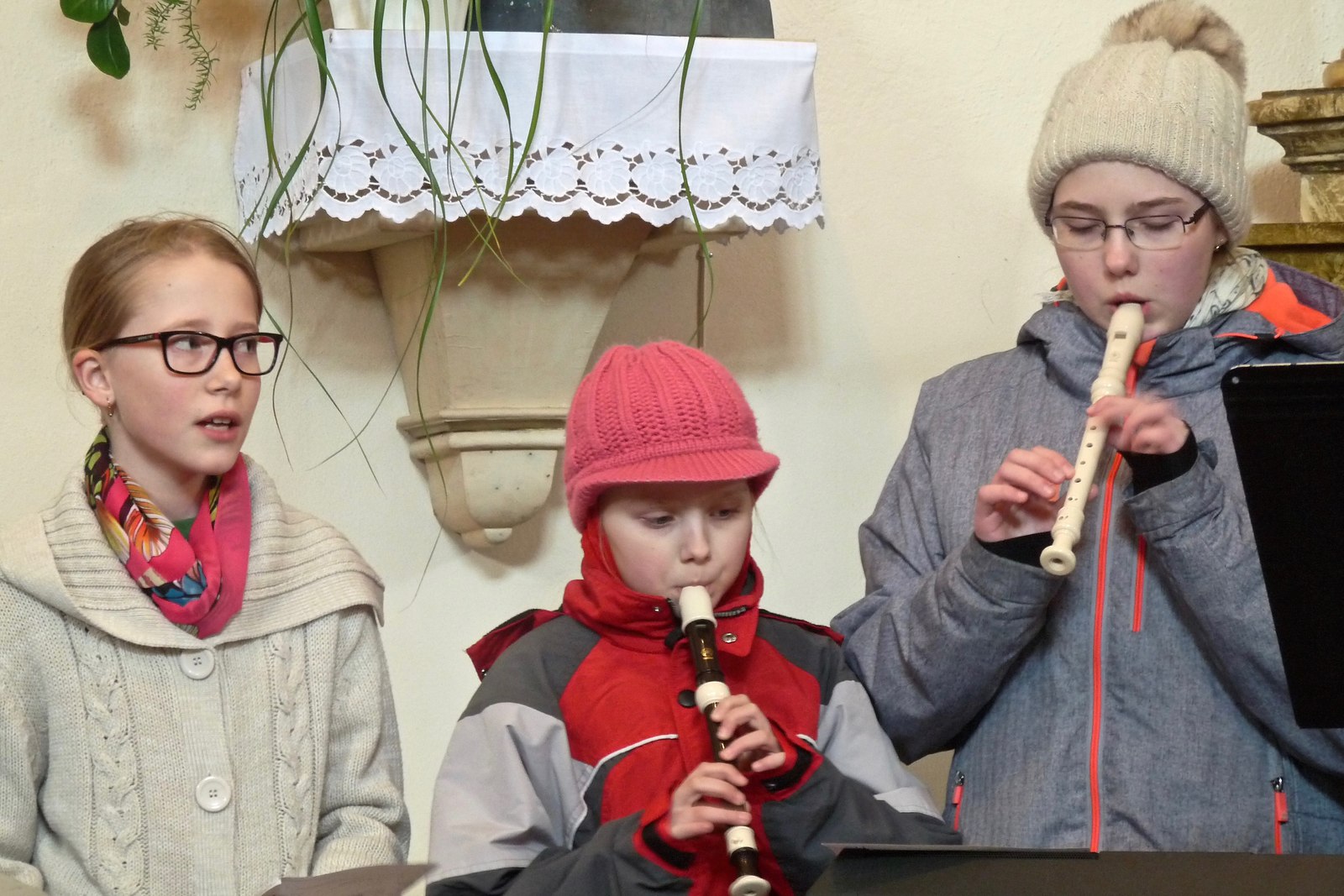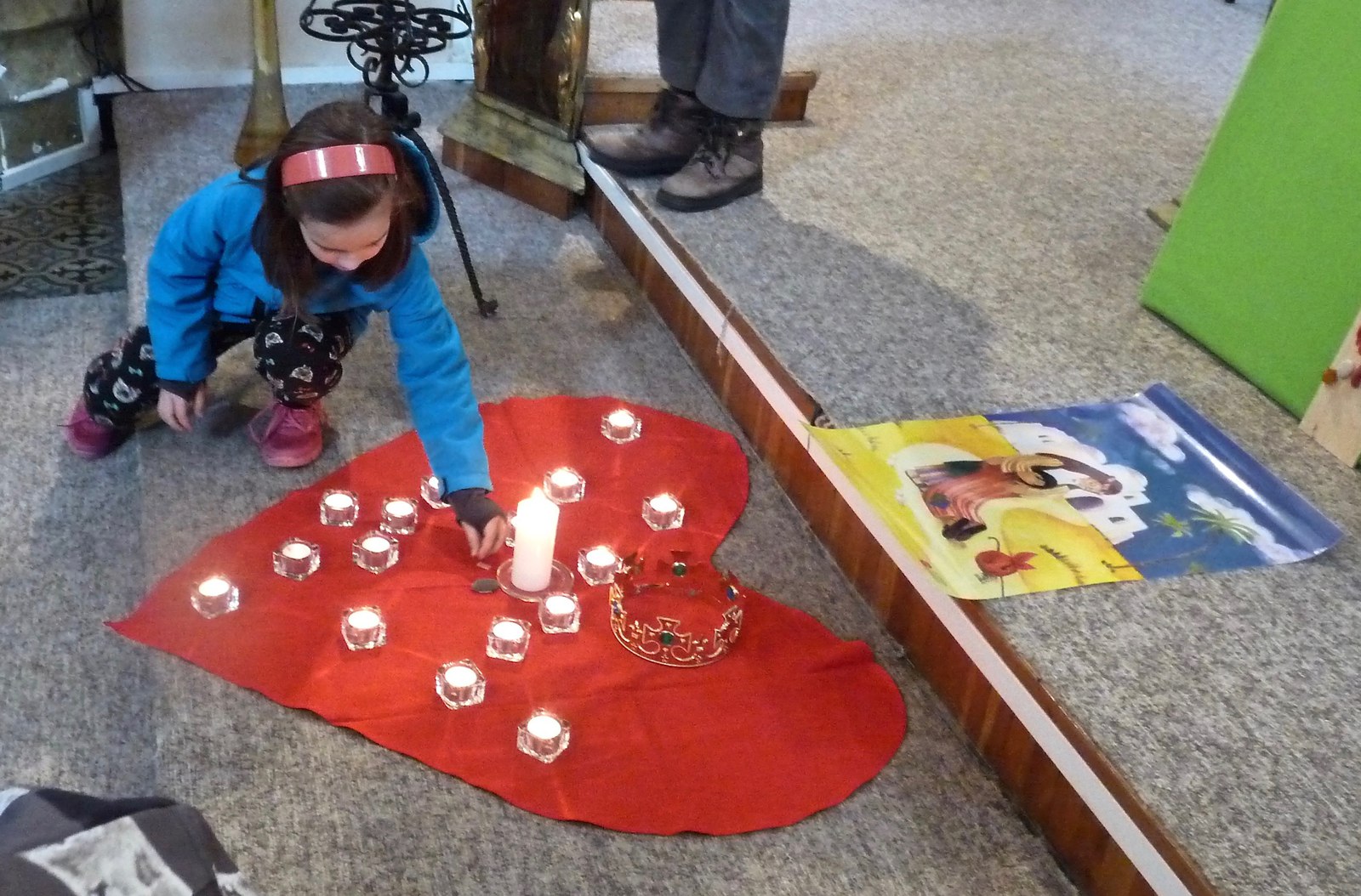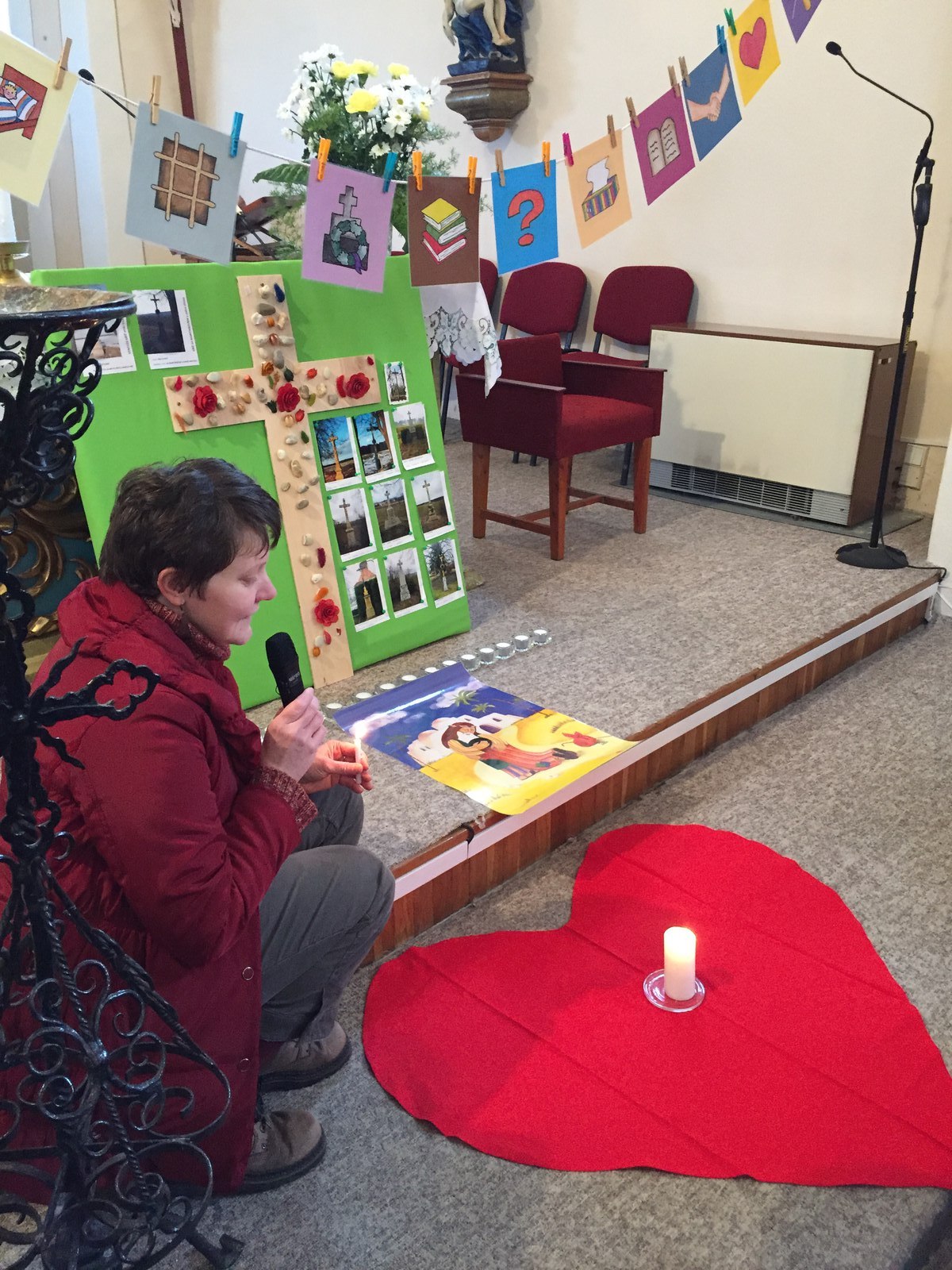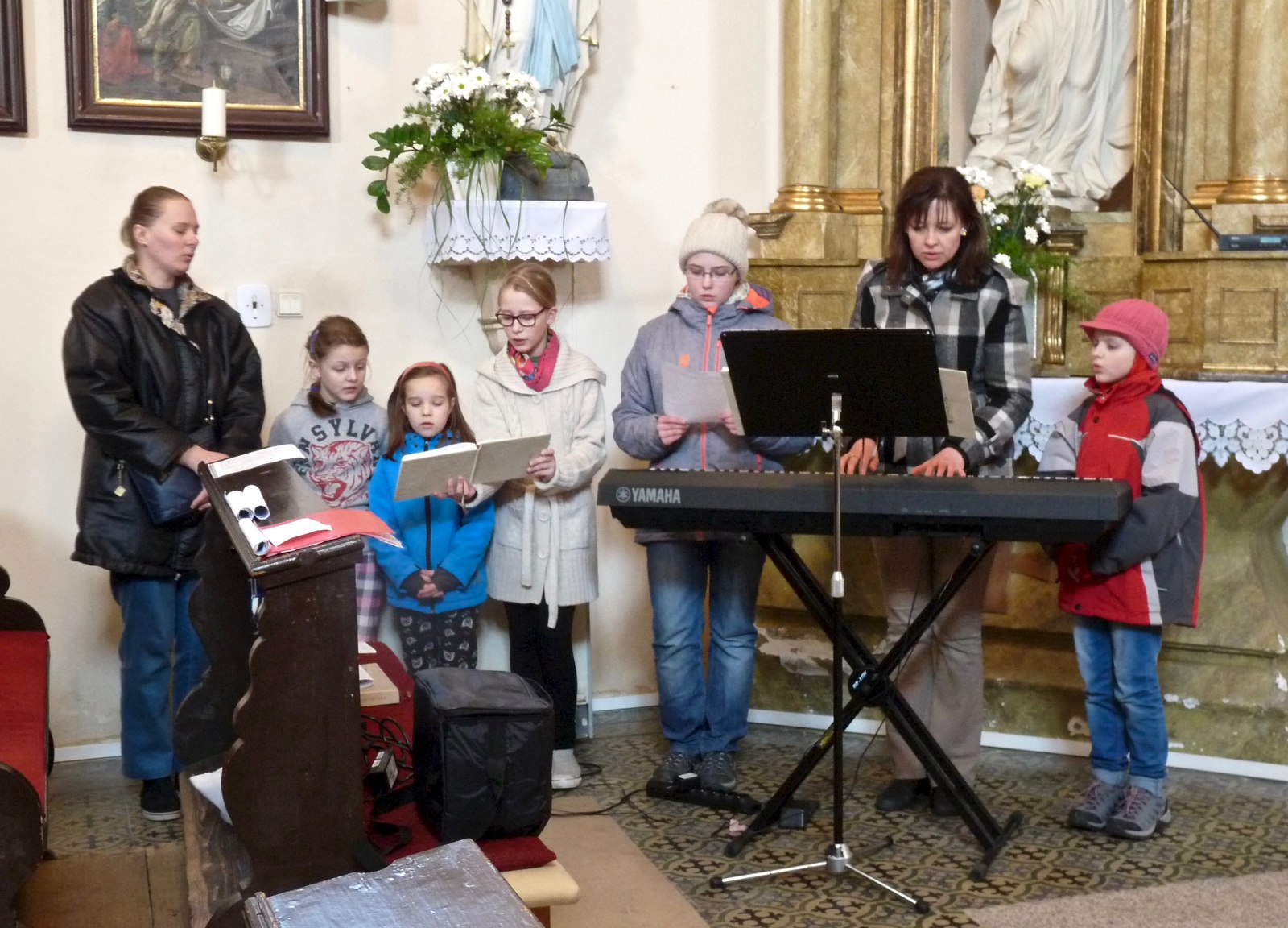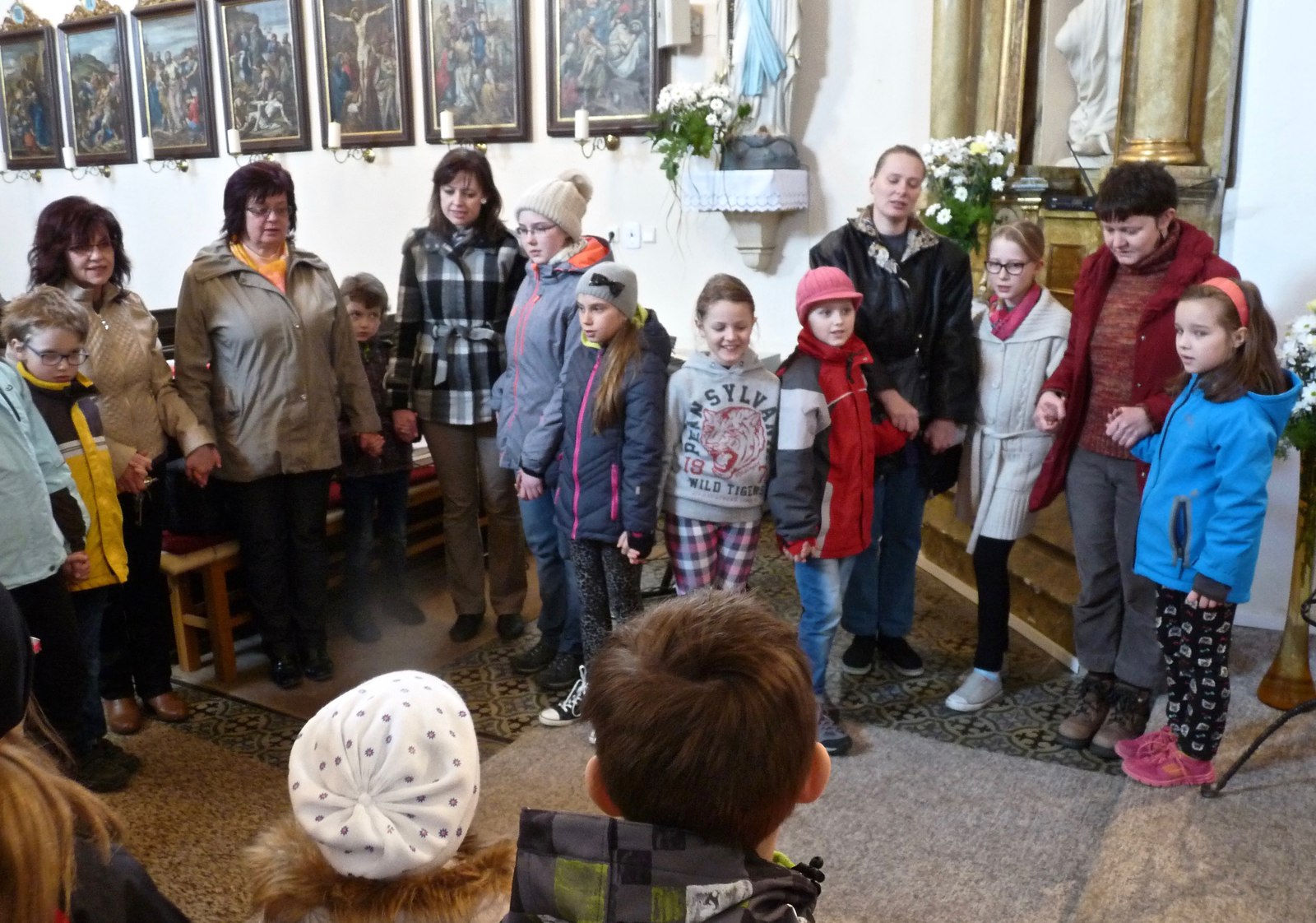 S dětmi, jejich rodiči a prarodiči jsme se sešli ve 14,30 před kostelem, kde byly dětem rozdány obrázky se skutky tělesného a duchovního milosrdenství, které nesly v průvodu do kostela a v presbytáři přečetly modlitbu na těchto obrázcích. P. Ladislav Kozubík přečetl evangelium o Milosrdném otci a vyslechli jsme si duchovní slovo. Tuto pobožnost doprovázely děti zpěvem písní a žalmu. Na rozprostřené srdce před obětním stolem děti kladly svíce na znamení, že chtějí mít své srdce blízko Ježíši, a kamínky na znamení, že chtějí Ježíši svěřit své těžkosti bolesti a starosti. Paní katechetka Jitka Šebková vysvětlila dětem i nám všem vztah Ježíše - milosrdného Krále - ke všem lidem. My, kteří se smíme nazývat Božími dětmi, máme tedy jako Ježíš " moc" konat milosrdenství - dobrým skutkem, dobrým slovem, modlitbou.