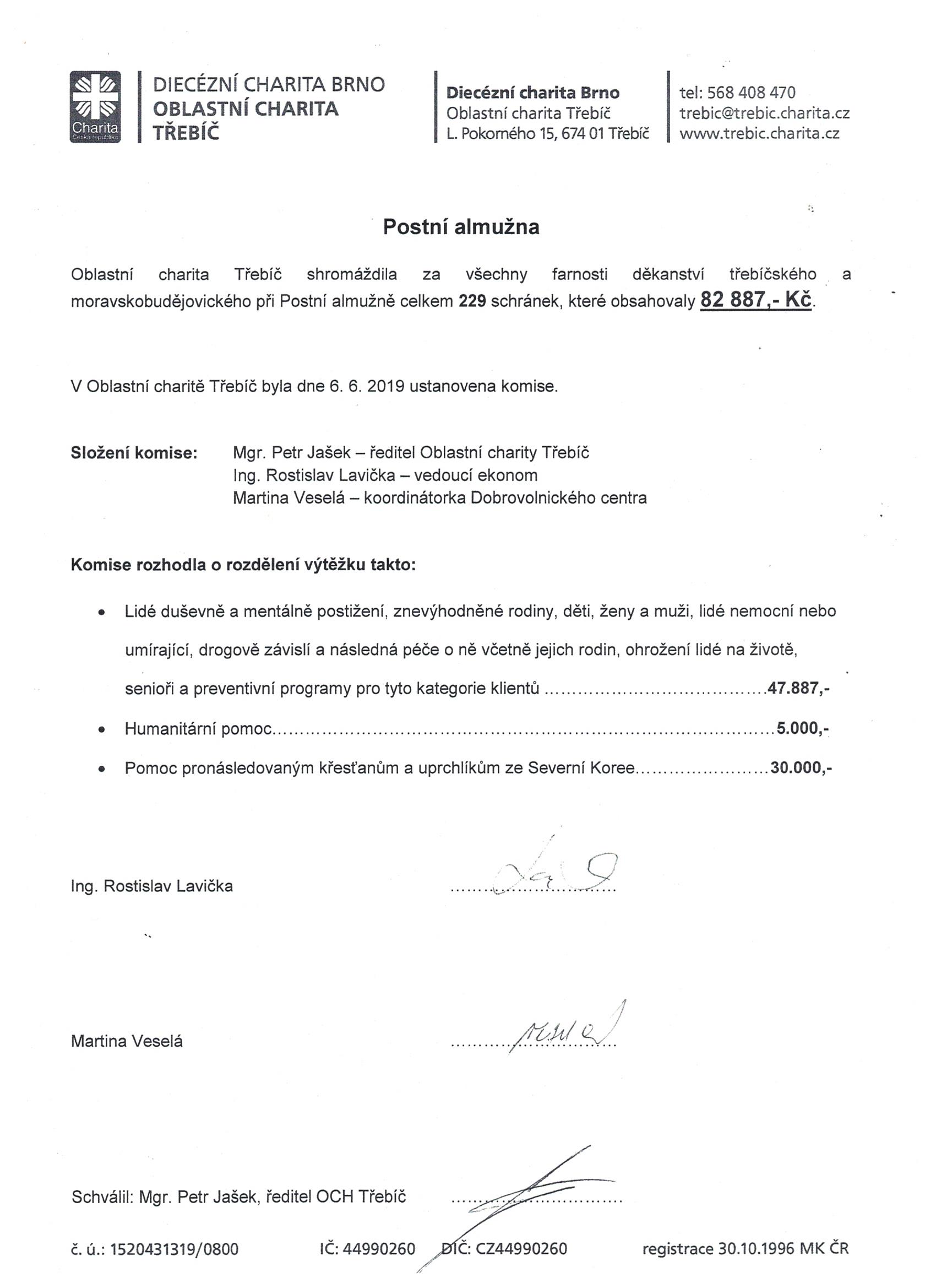 ROZDĚLENÍ VÝTĚŽKU POSTNÍ ALMUŽNY 2019